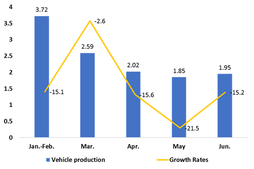 Accordingto the AskCI Database, national vehicle production volumes have had anoticeable decrease during the first 2 quarters of 2019. Vehicle production volumes in June were at 1.96 million vehicles, a 15.2% decrease over the previous year. A total of 12.14 million vehicles were manufactured during the first half of 2014, a 14.2% decrease over the previous year.