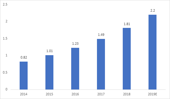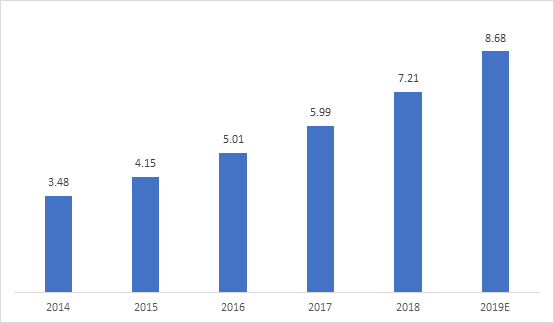 The Chinese robotics market has entered into a period of high-speed growth, with the industrial robotics market in particular having held the record for the world’s largest application market for several years. There is a great deal of potential for service robotics in China, with specialized robots expected to become a major source of growth in the near future. The trend of ‘robots replacing humans’ is expected to become the single largest growth driver for the market and guide the development of the robotics consumption market. The Chinese robot market surpassed a total of USD 7 billion in 2018. As technology continues to improve and the number of applications continue to expand, the Chinese robot market isprojected to reach a size of USD 8.68 billion by the end of 2019.